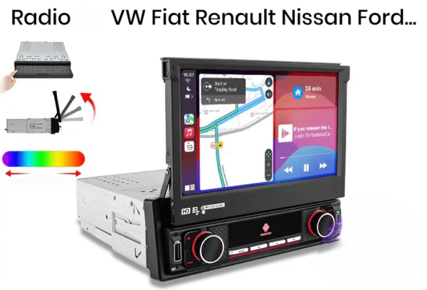 Universalus 1 DIN Android Multimedija Automobiliui su automatiškai išsiskleidžiančiu 7 colių IPS jutikliniu ekranu – tai išmanus sprendimas šiuolaikiniam automobiliui. Įrenginys palaiko belaidį Apple CarPlay ir Android Auto, leidžiančius naudoti telefono funkcijas – navigaciją, muziką, skambučius, žinutes ir kt. – tiesiai iš ekrano.