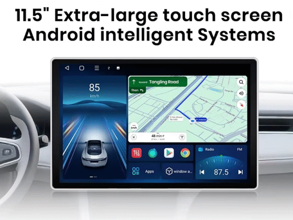11.5 colių QLED jutiklinio ekrano Android Multimedija Automobiliui – tai modernus sprendimas automobiliams, siekiantiems funkcionalumo ir aiškaus vaizdo kokybės. Šis universalus 2 DIN grotuvas palaiko belaidį Apple CarPlay ir Android Auto, leisdamas naudotis telefono funkcijomis – navigacija, skambučiais, muzika ir pranešimais – tiesiai iš ekrano.