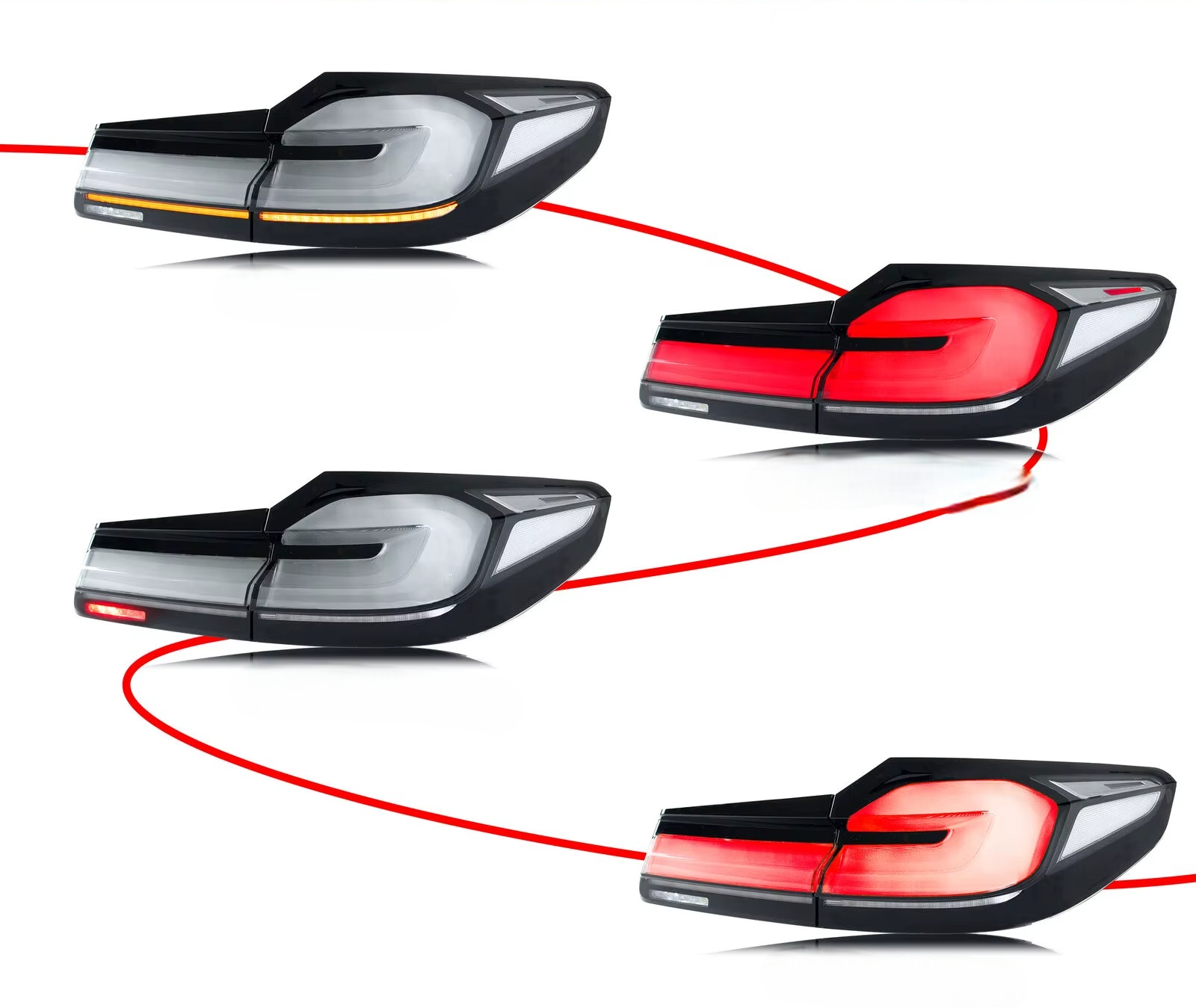 BMW G30 galiniai LED žibintai – tai modernus ir aukštos klasės sprendimas, skirtas BMW 5 serijos G30 (2017–2020 m.) automobiliams, norintiems atnaujinti galinę automobilio dalį ir pagerinti matomumą kelyje. Pažangi LED technologija užtikrina ryškų, tolygų apšvietimą, greitą šviesos reakciją bei ilgaamžiškumą, o modernus dizainas suteikia automobiliui dar daugiau prestižo.