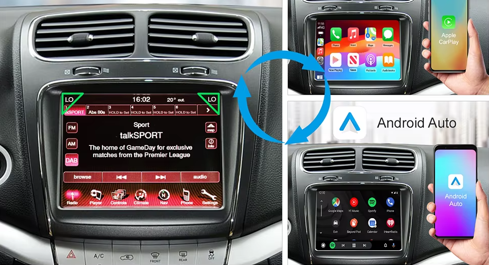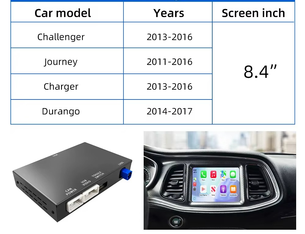 Dodge CarPlay modulis – modernus sprendimas, leidžiantis integruoti Apple CarPlay ir Android Auto į originalią Dodge multimedijos sistemą su 8.4 colių ekranu.