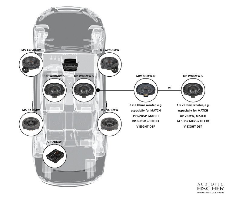 Garsiakalbiai automobiliui MATCH UP W8BMW-S – aukštos kokybės subwooferiai, skirti BMW automobiliams su montavimu į originalias vietas po sėdynėmis.