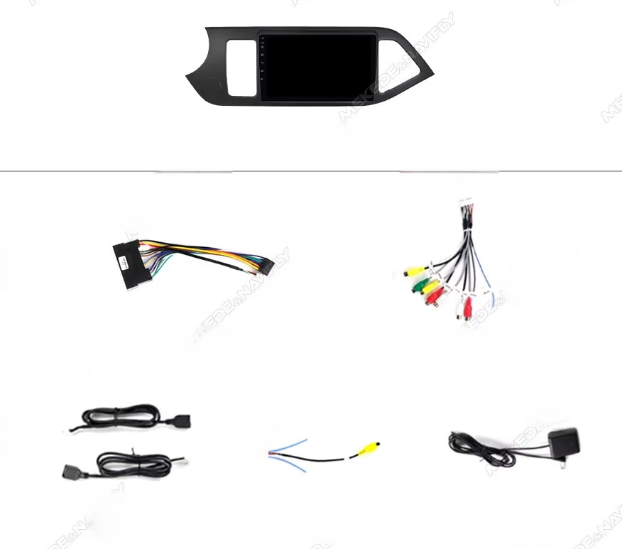Komplekte yra visi reikiami pajungimo laidai, vairo valdymui, kamerai, GPS antenai, FM perėjimas ir daug daug kitų variacijų.